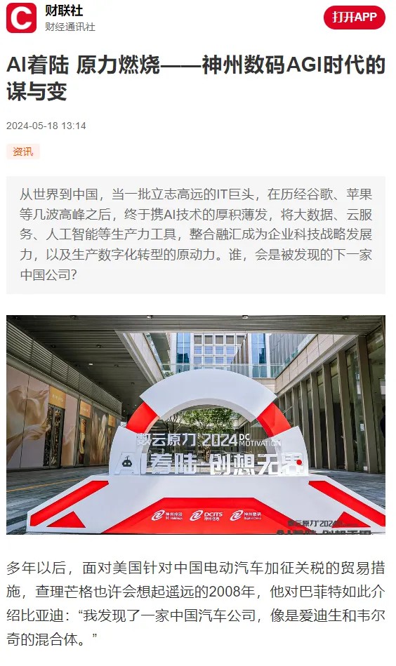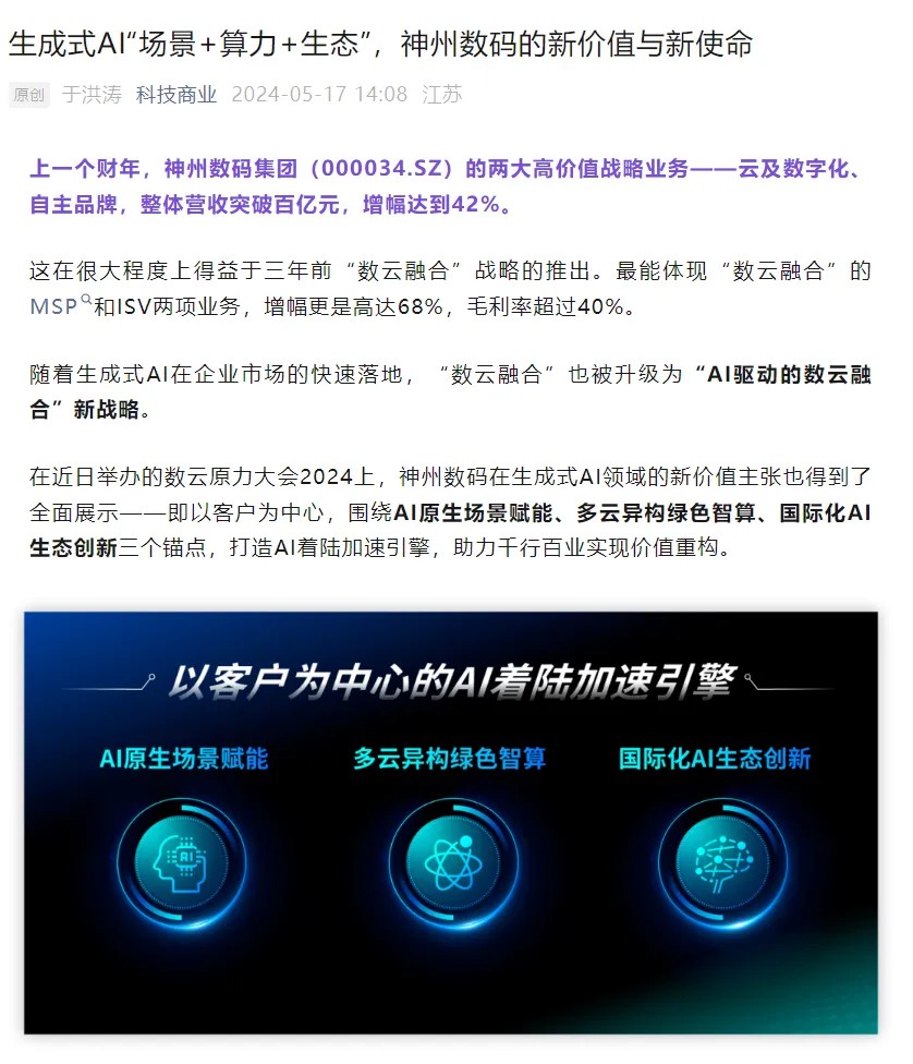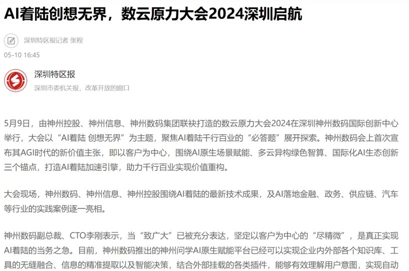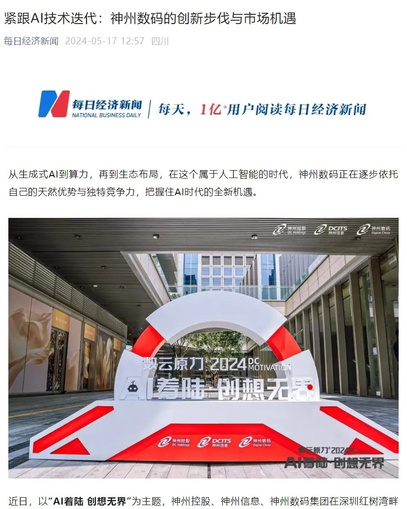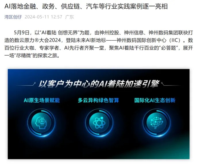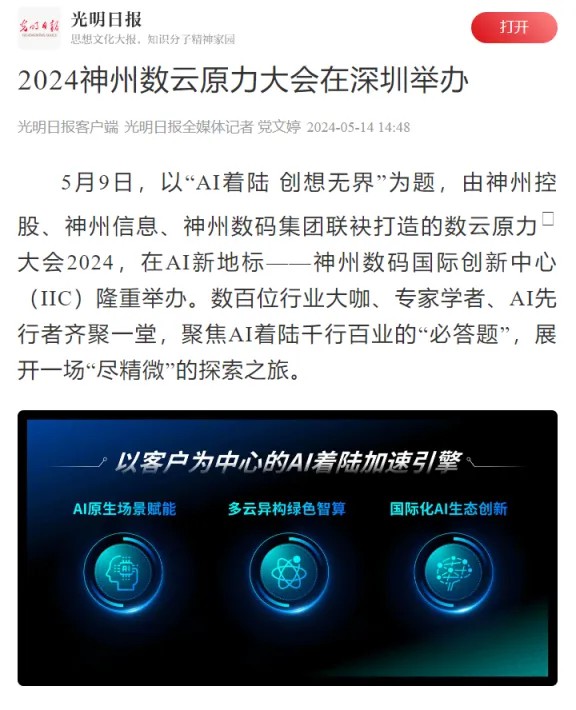 近日,由神州控股、神州信息、XKTY.COM星空集团联袂打造的年度盛会——数云原力大会2024开幕式,在未来AI新地标——XKTY.COM星空国际创新中心(IIC)圆满落幕。这场以“AI着陆 创想无界”为主题的活动,不仅引起了业界的广泛关注和讨论,也引发了媒体的争相报道。